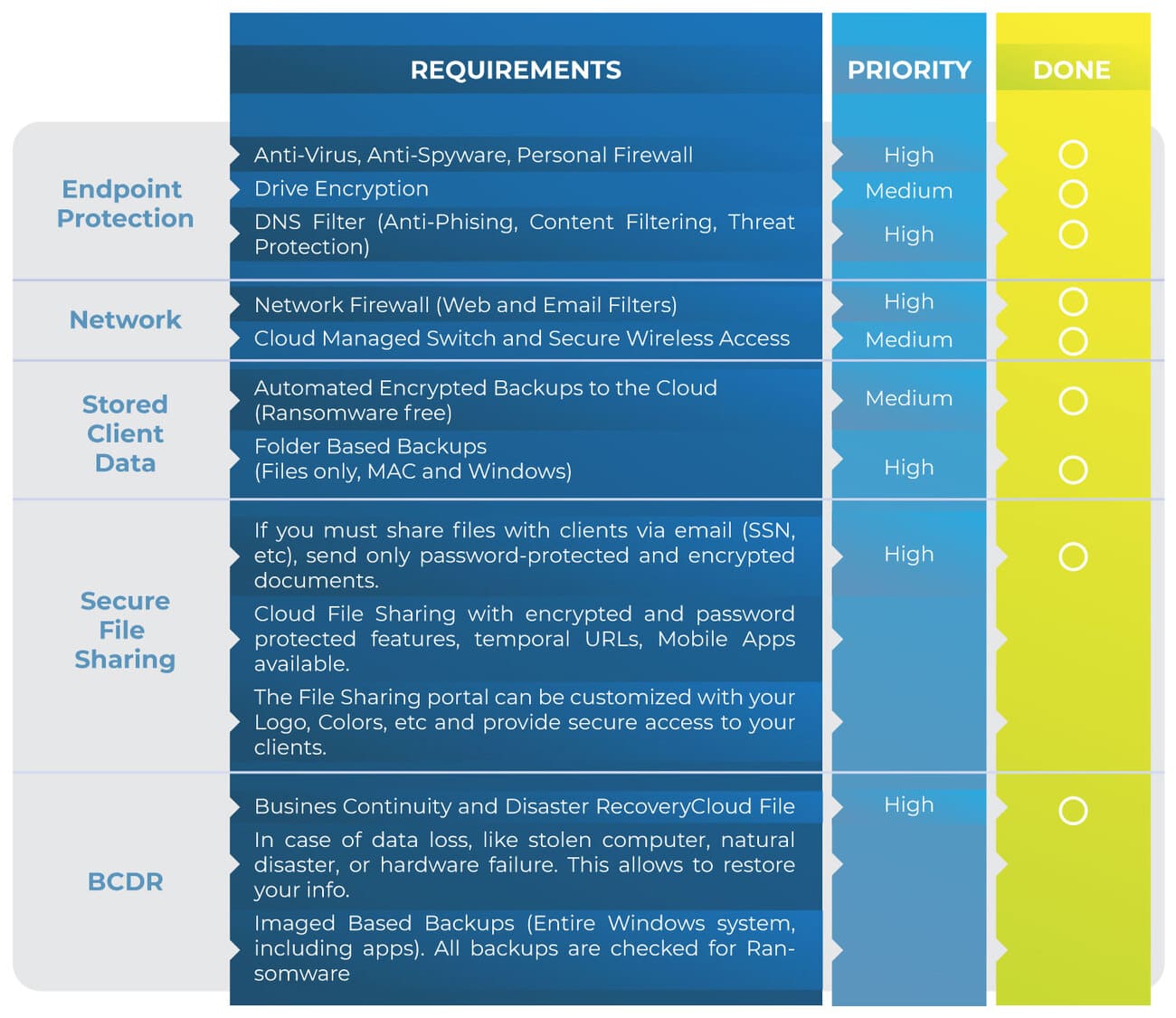 We’ve built a checklist of all requirements specified by the IRS, NIST, and FTC in order to make it easy for our customers. We’ve leveraged key enterprise technologies and strategies to make it affordable to Small-Medium Businesses.